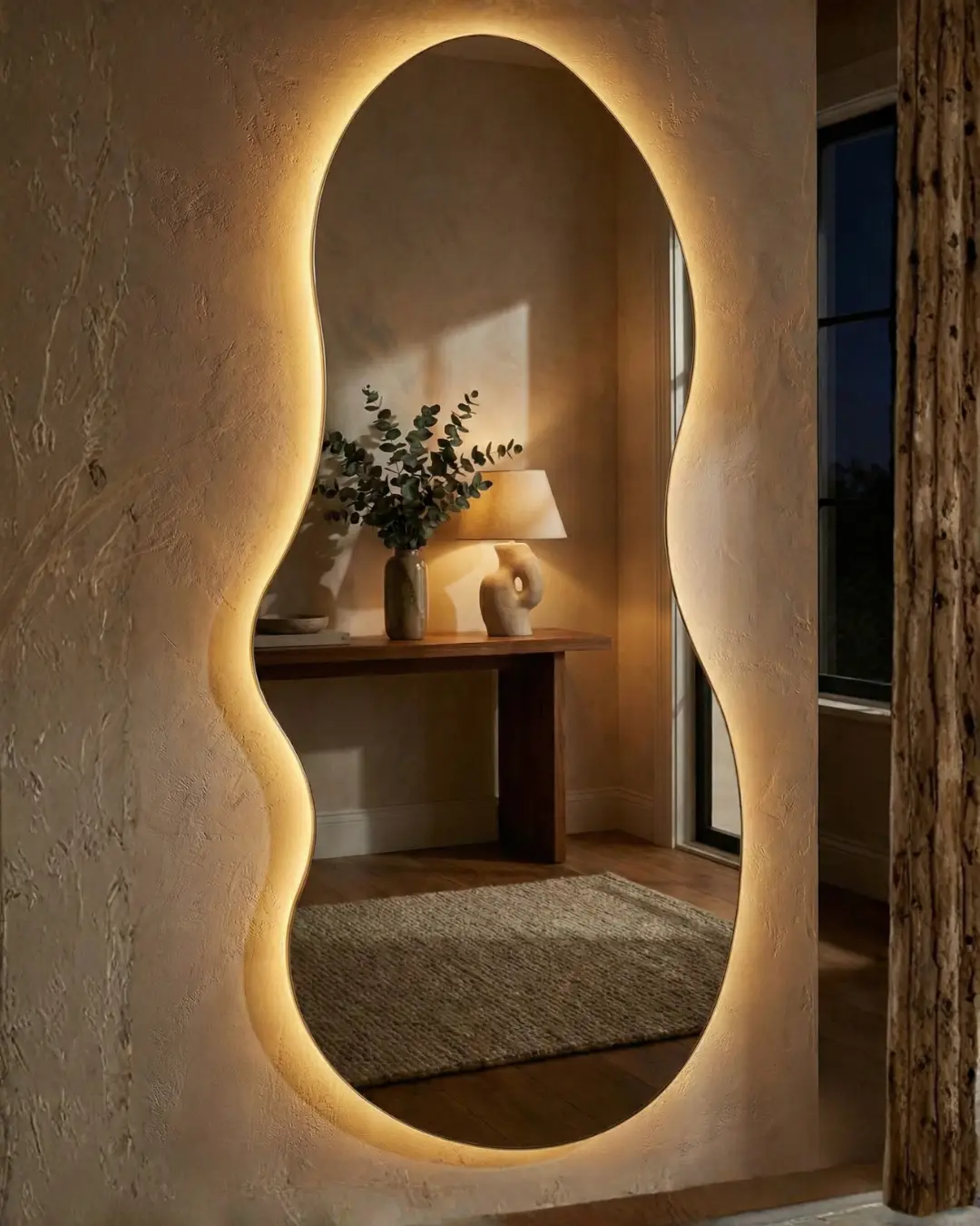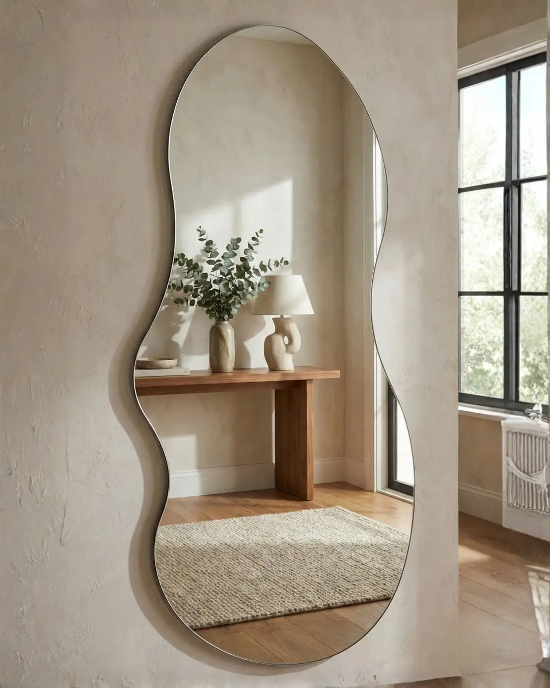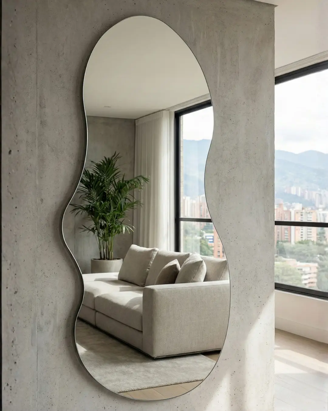 Reflexión Pura de Borde a Borde: Diseñado para una apariencia sin marco y sin fisuras, este espejo ofrece una superficie reflectante expansiva y continua. El sutil y delgado borde metálico pulido (apenas perceptible, pero de refinamiento minimalista) asegura que su silueta orgánica sea la protagonista, maximizando la luz y el espacio sin interrupciones visuales.