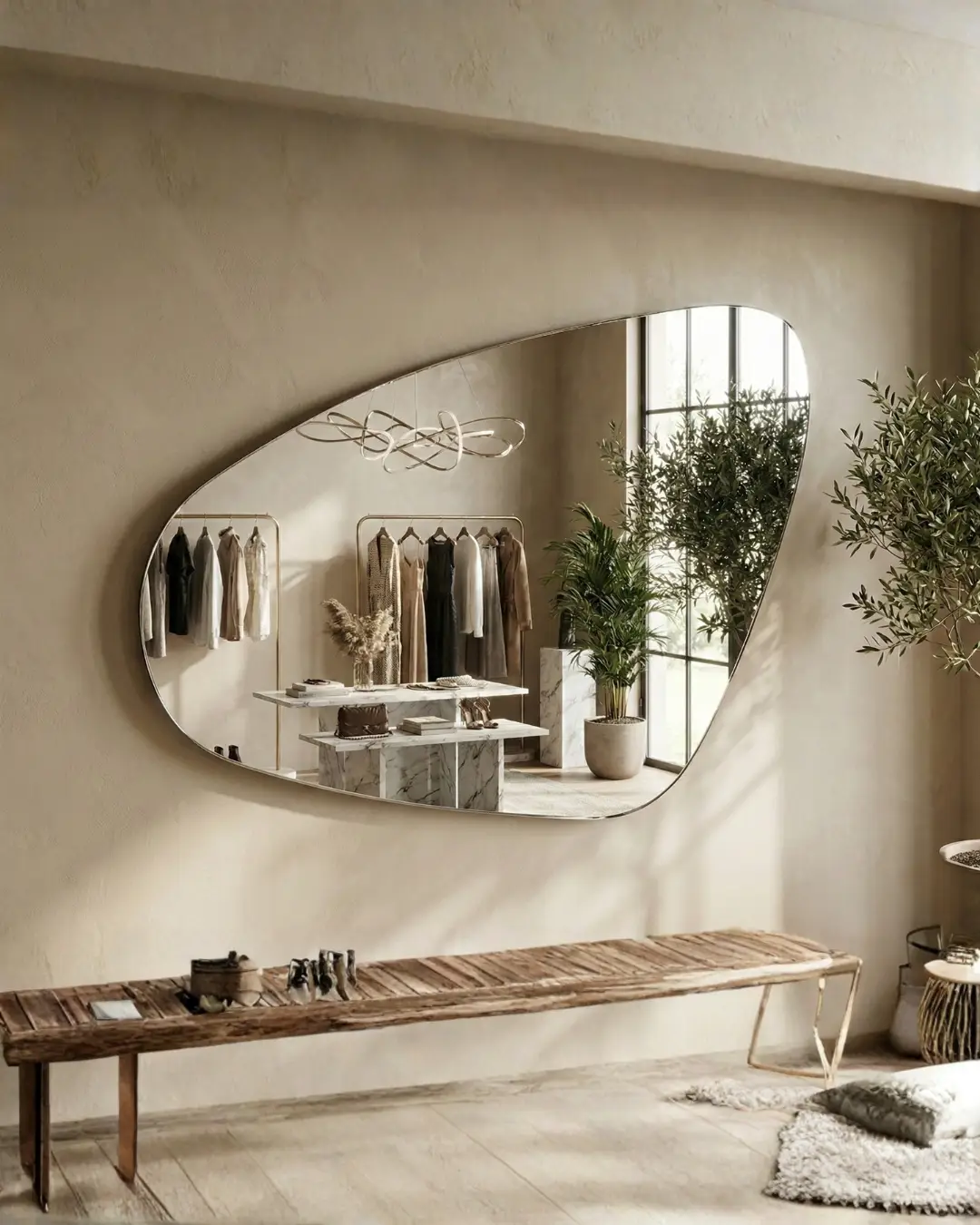 Impacto Visual y Amplitud: Con su generosa superficie reflectante, este espejo duplica visualmente el espacio y maximiza la luz natural. Como se muestra en nuestra imagen de referencia (image_0.png), es capaz de capturar y reflejar la esencia de su decoración, desde una cuidada colección de moda hasta la frescura de sus plantas, todo enmarcado por su forma única.