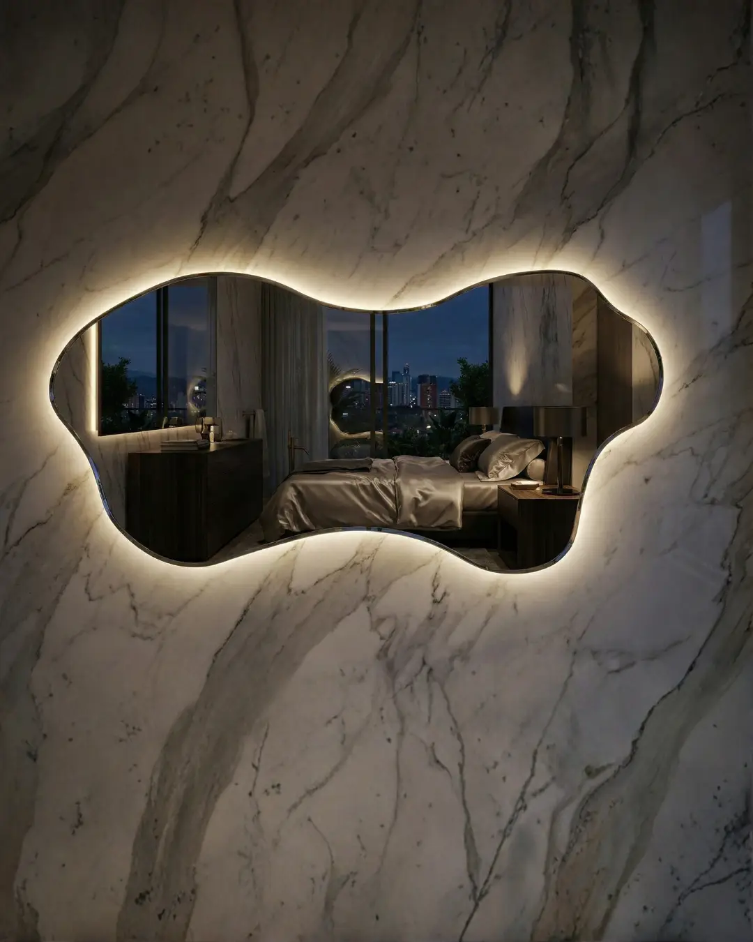 Reflexión Pura de Borde a Borde: Diseñado para una apariencia sin marco y sin fisuras, este espejo ofrece una superficie reflectante expansiva y continua. El sutil y delgado borde metálico pulido (apenas perceptible, pero de refinamiento minimalista) asegura que su silueta orgánica sea la protagonista, maximizando la luz y el espacio sin interrupciones visuales.